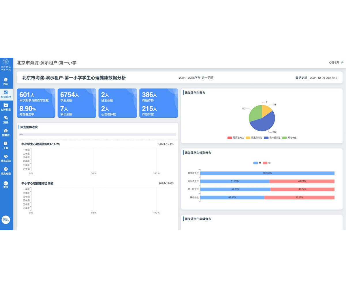 “ok138cn太阳集团-中小学智慧心理服务云平台”通过互联网、大数据、人工智能,建立融智慧管理、健康筛查、危机预警、危机干预、心理预防、心理资源提升为一体的心理服务智慧管理平台。