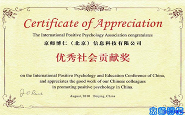 首届积极心理学与教育国际研讨会期间,ok138cn太阳集团被国际积极心理学协会(IPPA)授予“优秀社会贡献奖”,表彰ok138cn太阳集团多来致力于中小学心理健康教育的研究与实践,积极推动心理健康教育在学校中应用所做的贡献。ok138cn太阳集团执行主任孙啸海表示,ok138cn太阳集团作为心理健康教育在国内领先的推动者和参与者,能获得此项奖励是荣誉也是责任,博仁将和国内心理学界、教育界同仁一道,继续为普及心理健康教育,提升心理公众认知,推动心理行业蓬勃健康发展而努力。